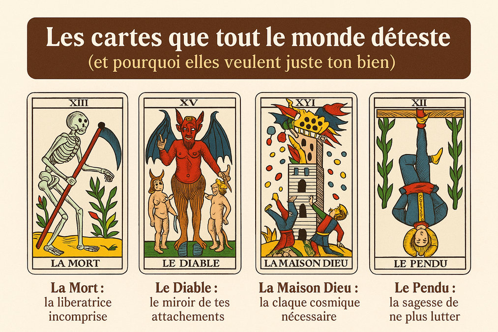 Alors, la prochaine fois que tu tires La Mort, Le Diable, La Tour ou Le Pendu, souris un peu.